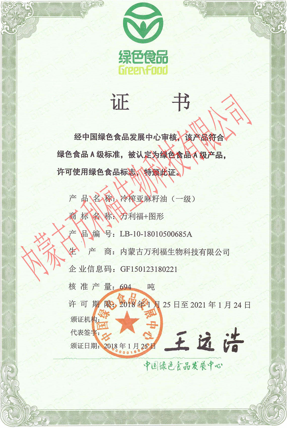 當(dāng)前位置:首頁(yè) > 新聞動(dòng)態(tài) > 公司新聞內(nèi)蒙古萬(wàn)利福生物科技有限公司綠色食品證書于2018年1月正式下發(fā),我公司一直秉承“有健康才有幸?!钡睦砟畎l(fā)展至今,公司老總對(duì)于質(zhì)量把控非常嚴(yán)格,每一項(xiàng)都要嚴(yán)格查辦,這是對(duì)廣大支持和食用我們產(chǎn)品客戶的一個(gè)負(fù)責(zé),二是對(duì)自己創(chuàng)辦企業(yè)的一個(gè)負(fù)責(zé)。萬(wàn)利福亞麻籽油是您健康的選擇。選擇我們,定讓你們不負(fù)眾望。